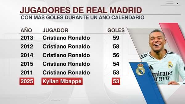 数据显示,C罗曾五次占据皇马单年射手榜榜首:2013年59球、2012年58球、2014年56球、2015年54球以及2011年的53球。如今姆巴佩的名字首次出现在这份精英榜单中。